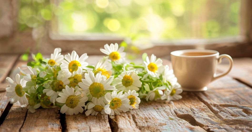 Flores frescas de manzanilla con té de hierbas en mesa de madera rústica con luz natural